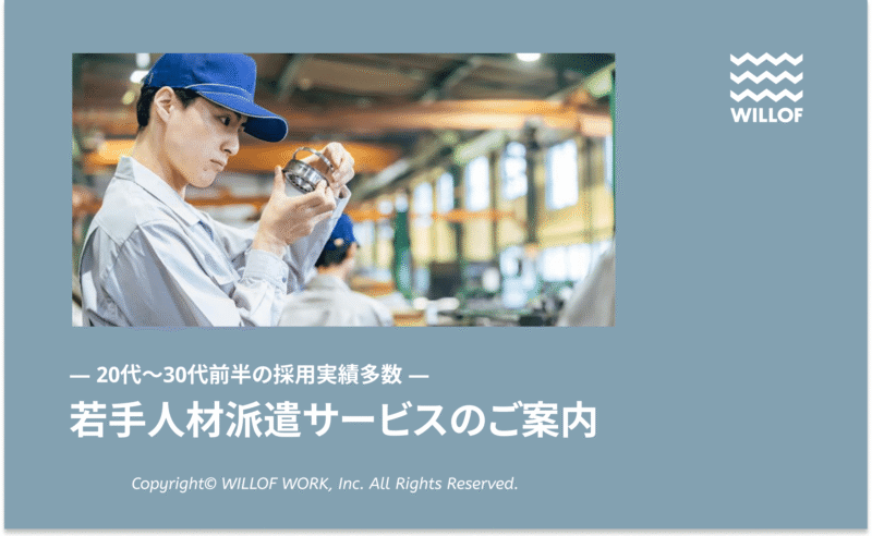 製造業界に特化した若手人材派遣サービス「専門職派遣」のご案内です。WILLOFでは、独自の採用プロセスと現場配属後のスタッフフォロー、キャリアアッププランの提示により、近年人手不足化の加速する製造業界において、20代~30代前半の若手人材の安定した採用と定着を実現します。