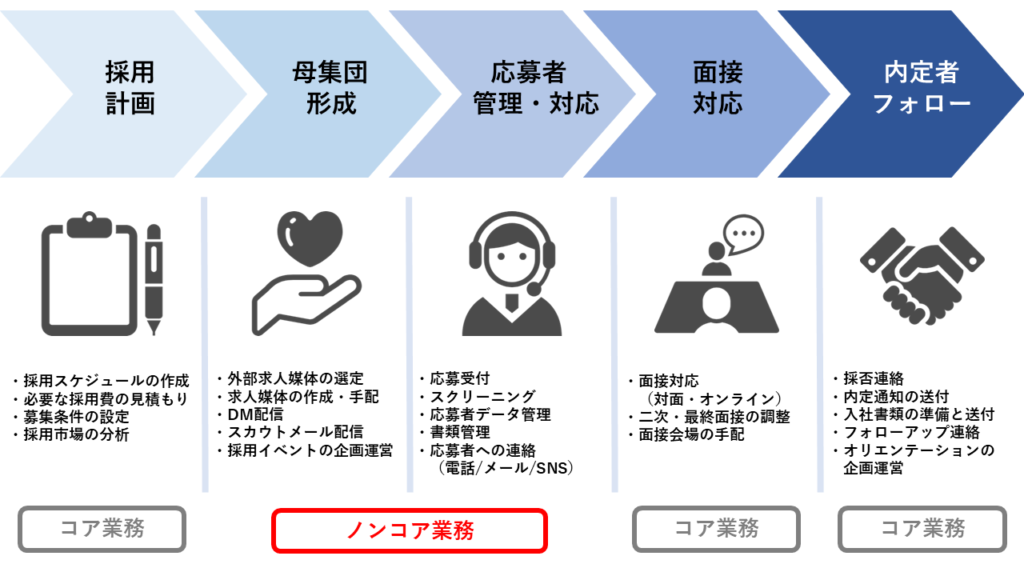 また、すべての業務を依頼するとコストが増加するため、自社の課題を明確にし、本当に必要な業務を特定することが重要です。対応可能な会社を選定することで、コストを抑えつつ、効果的な採用活動を実施できます。