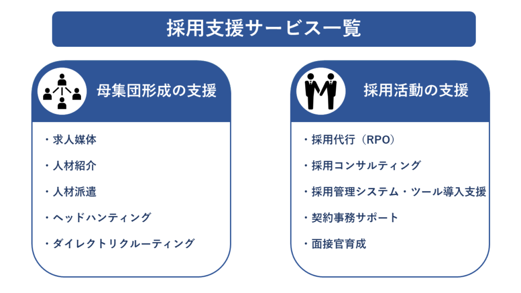 大きく「母集団形成の支援」と「採用活動の支援」の2つに分けて、それぞれの役割や代表的なサービス内容を詳しく見ていきましょう。