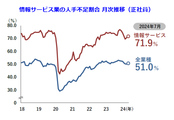 実際、帝国データバンクの「人手不足に対する企業の動向調査(2024年7月)」では、正社員が不足している企業は全体の51.0%、情報サービス業に限ると71.9%にも上っており、人材不足が深刻であることがわかります。