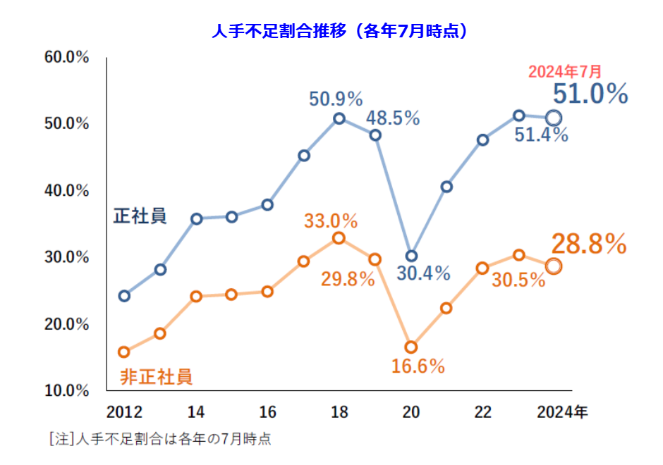 また、厚生労働省の発表によると、2024年9月時点の有効求人倍率は1.24倍と高水準を維持しており、企業間の人材獲得競争は依然として激しい状況です。