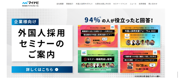 株式会社マイナビグローバルは、日本有数の人材サービス企業グループのノウハウを生かした、採用支援を行っている登録支援機関です。義務的支援に加えて、特定技能試験対策の「SSWスクール」や受け入れ企業向けの研修など学習支援も整っている点が特徴です。